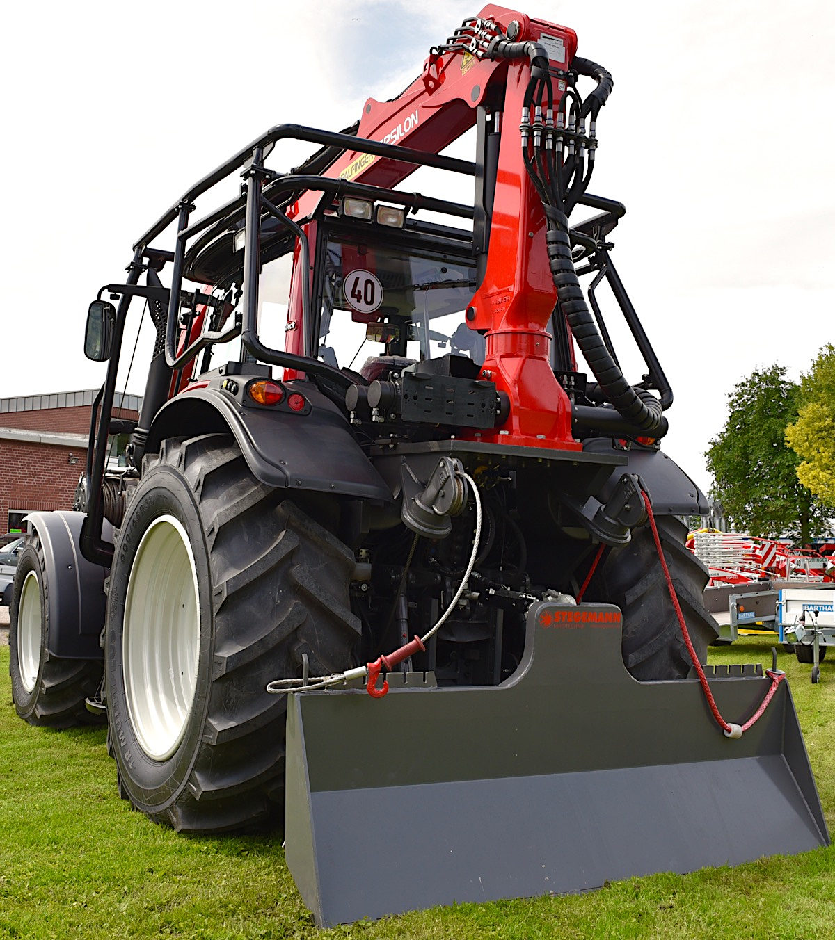 Die Kräne werden mit einem stabilem Rahmen direkt mit der Hinterachse und dem Rumpf des Schleppers verbunden.