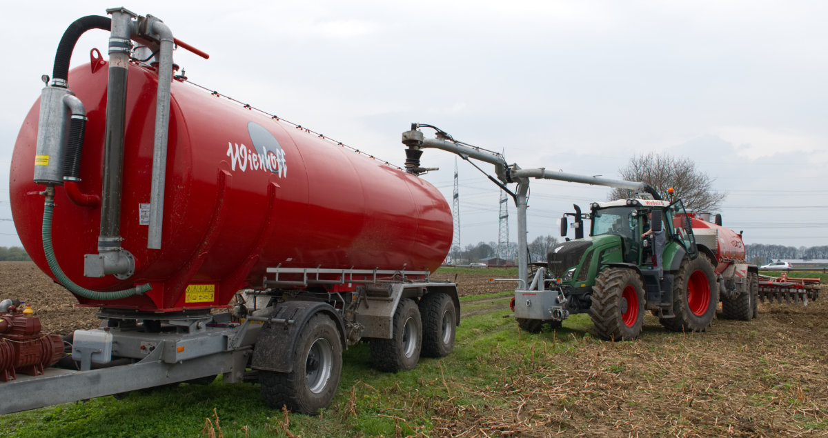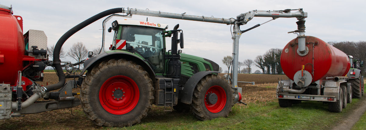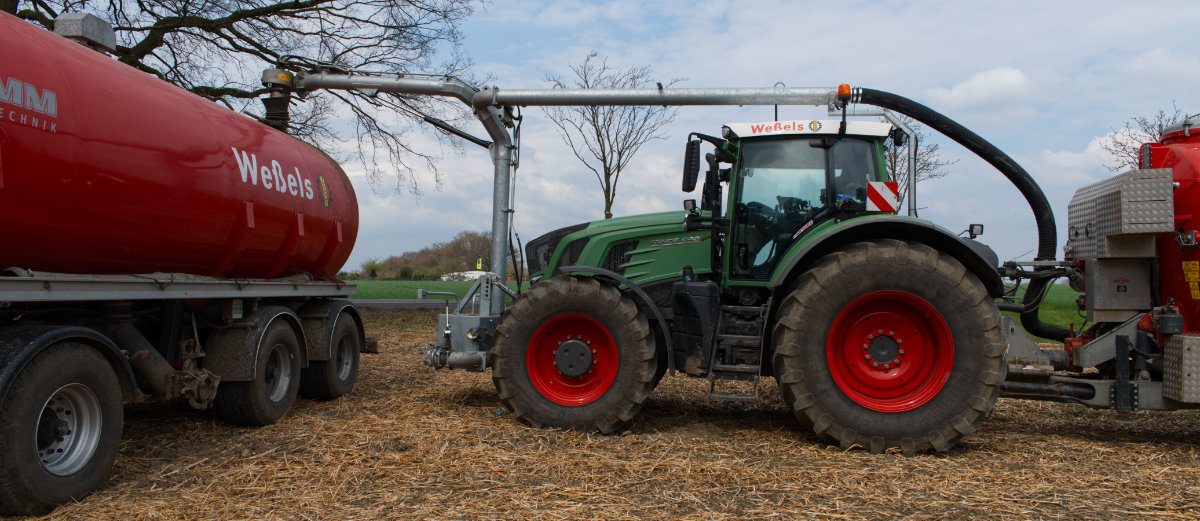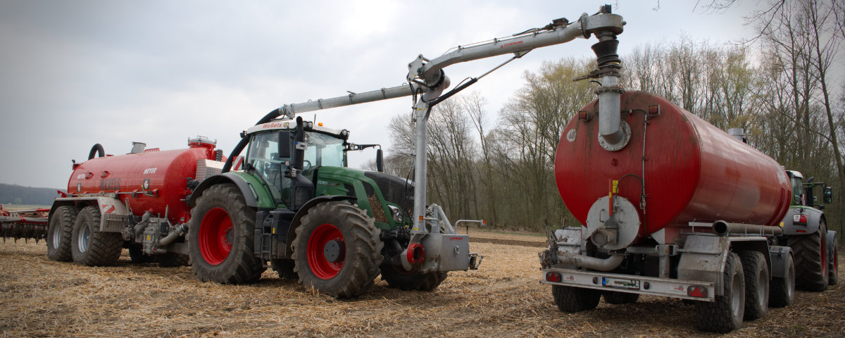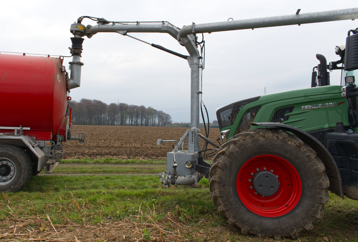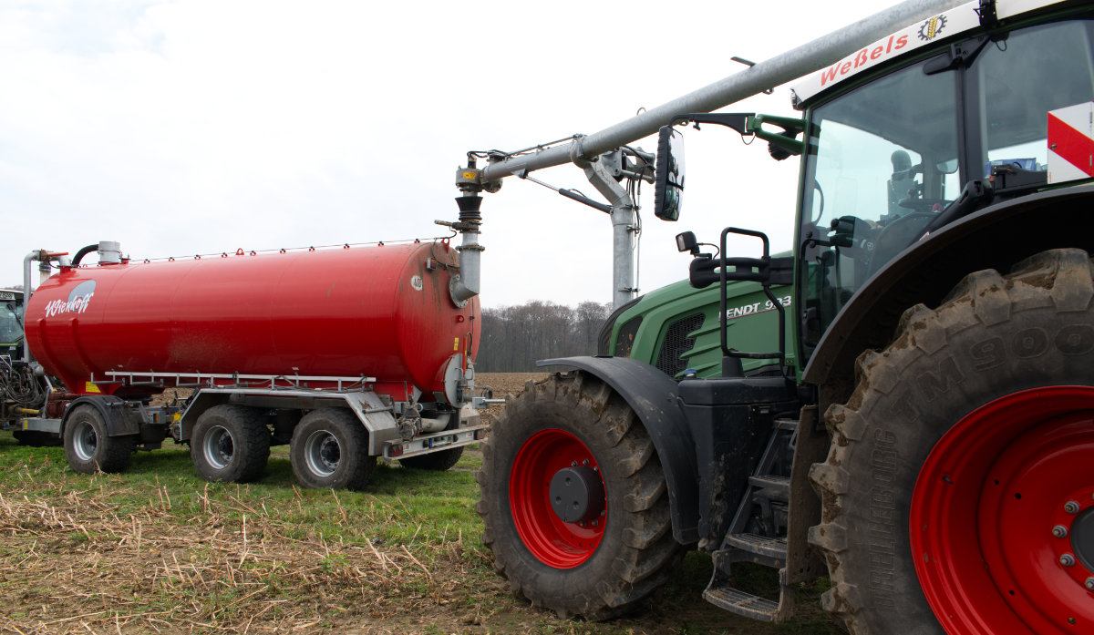 Zum Umfüllen vom Transportfass zum Ausbringfass muss der Schlepper das Feld nicht verlassen und der Fahrer nicht absteigen. In ca. 3,5 Minuten ist der Vorgang abgeschlossen.