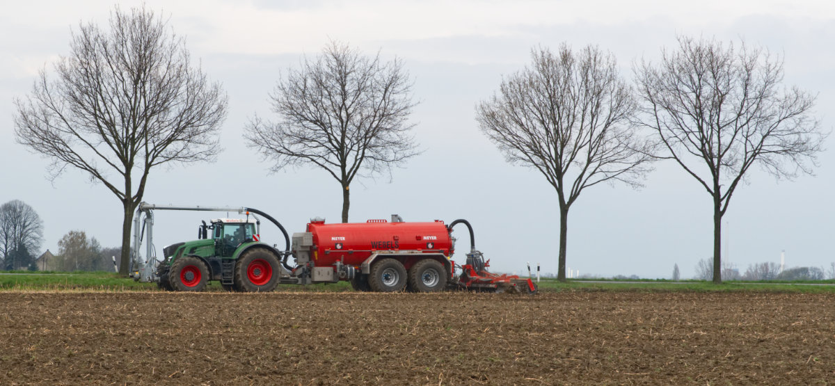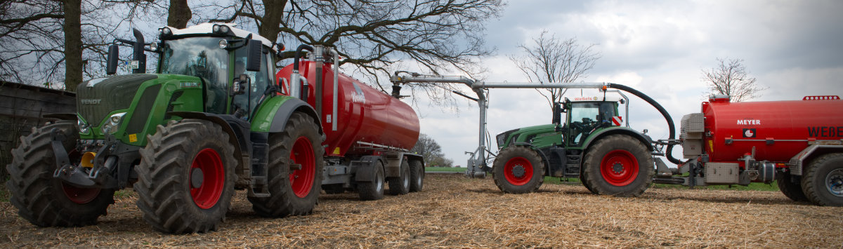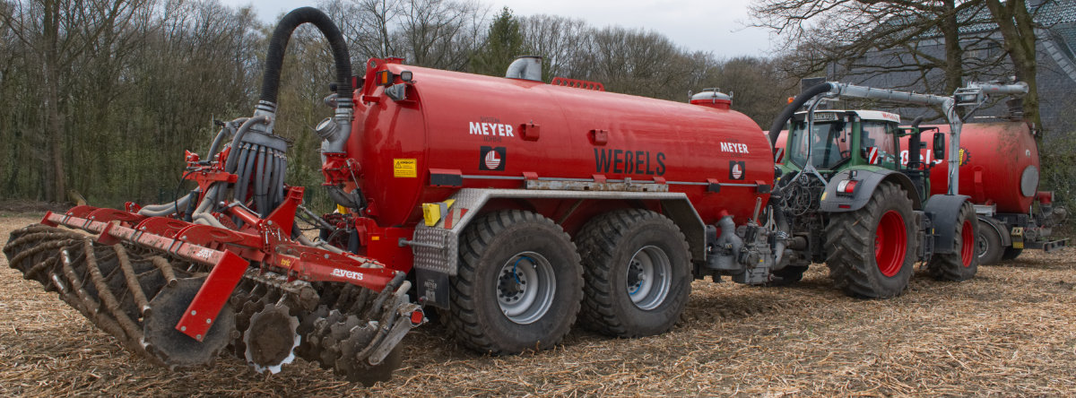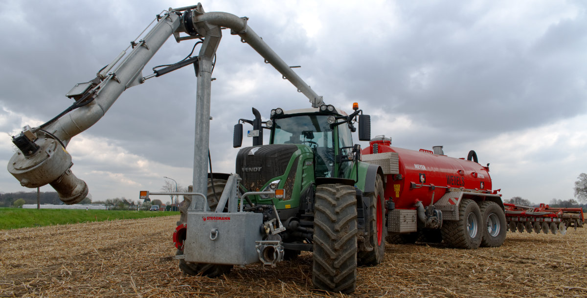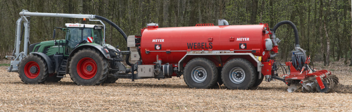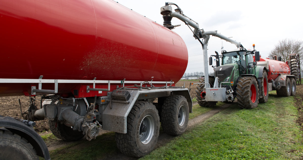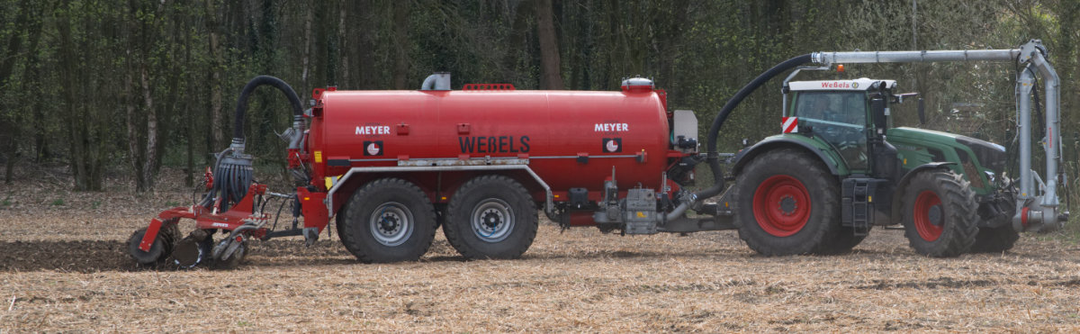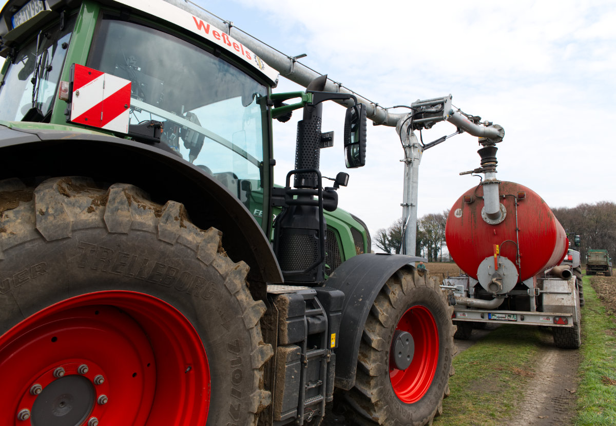 Zum Umfüllen vom Transportfass zum Ausbringfass muss der Schlepper das Feld nicht verlassen und der Fahrer nicht absteigen. In ca. 3,5 Minuten ist der Vorgang abgeschlossen.
