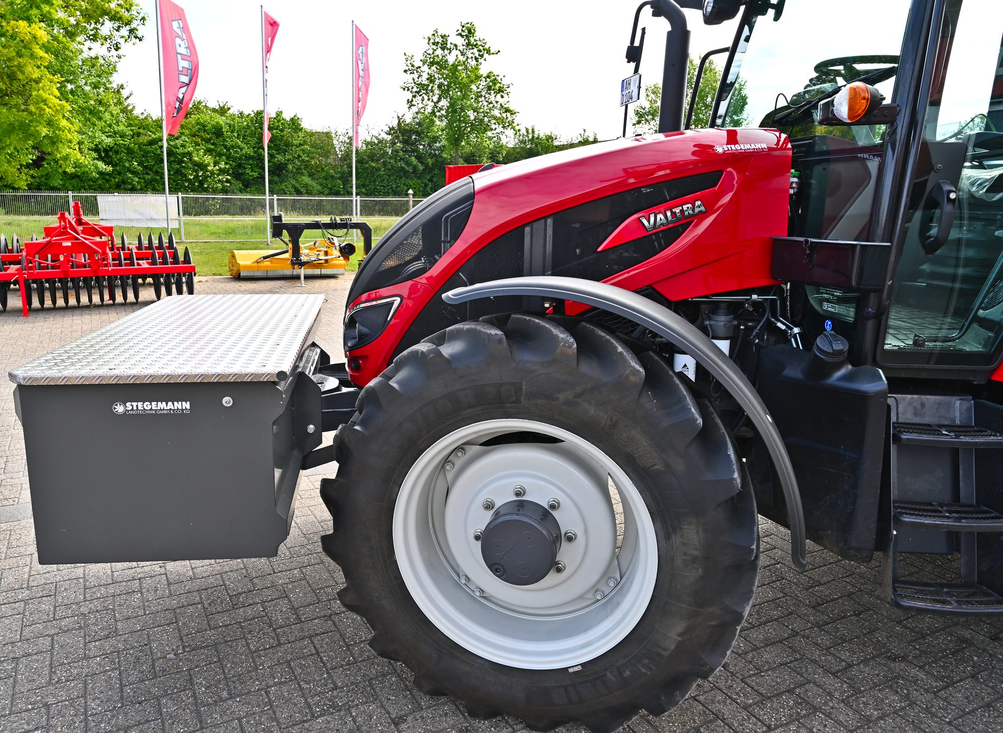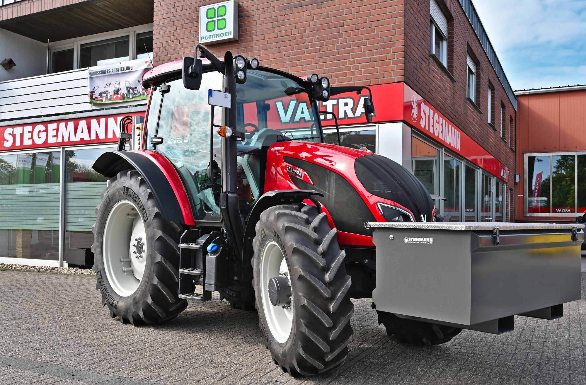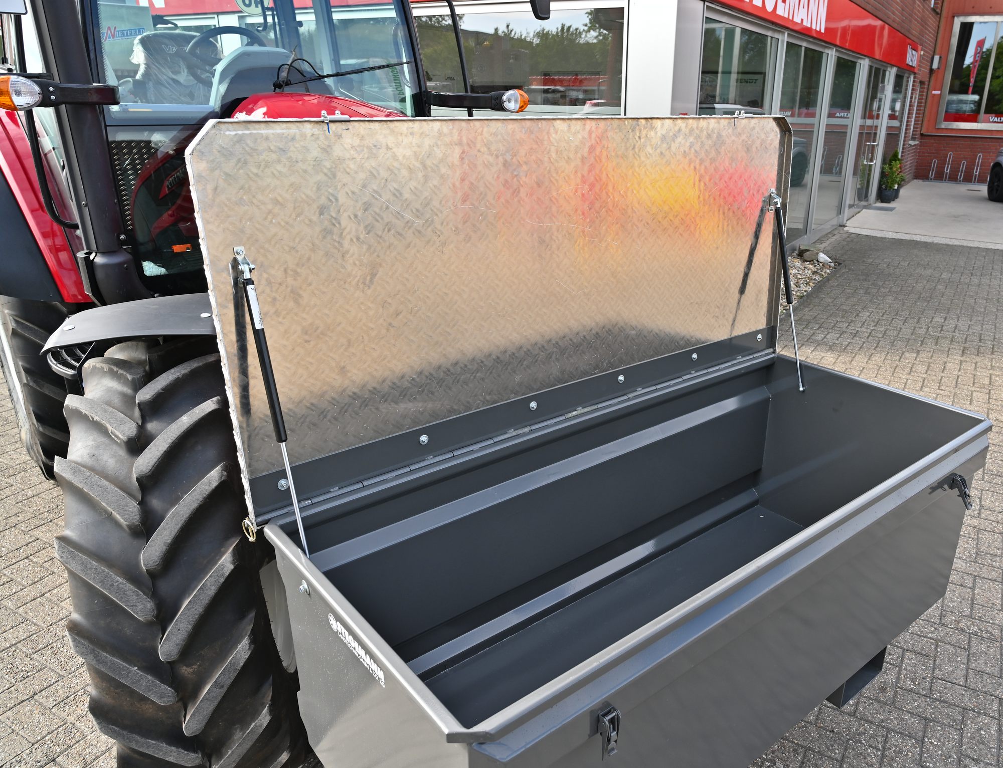 Gemeinsam mit der STEGEMANN Maschinenbau fertigten wir hierfür eine stabile Werkzeugkiste aus 3 mm Stahlblech, die verstärkt mit Stangenschanieren in der Aufnahme für Frontgewichte befestigt ist.